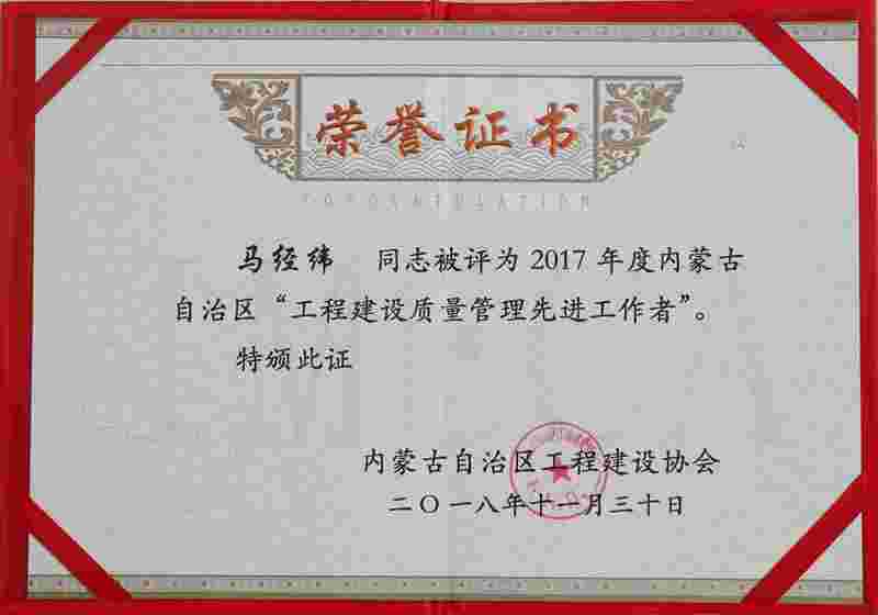 马经纬同志荣获自治区“工程建设质量管理先进工作者”
